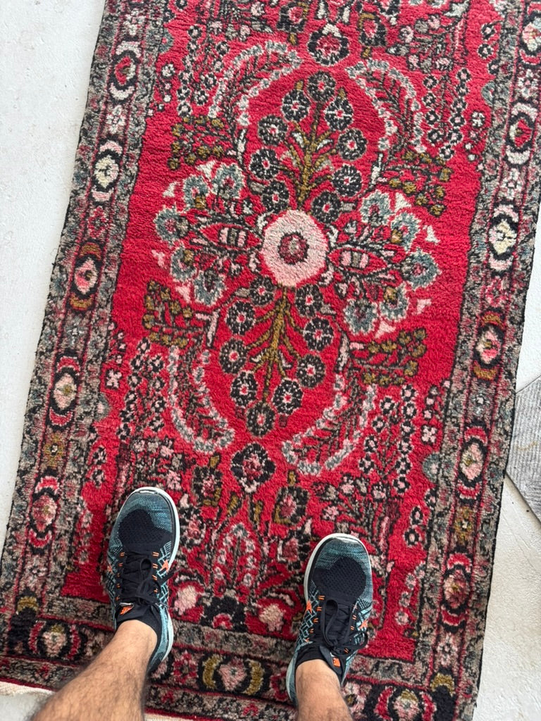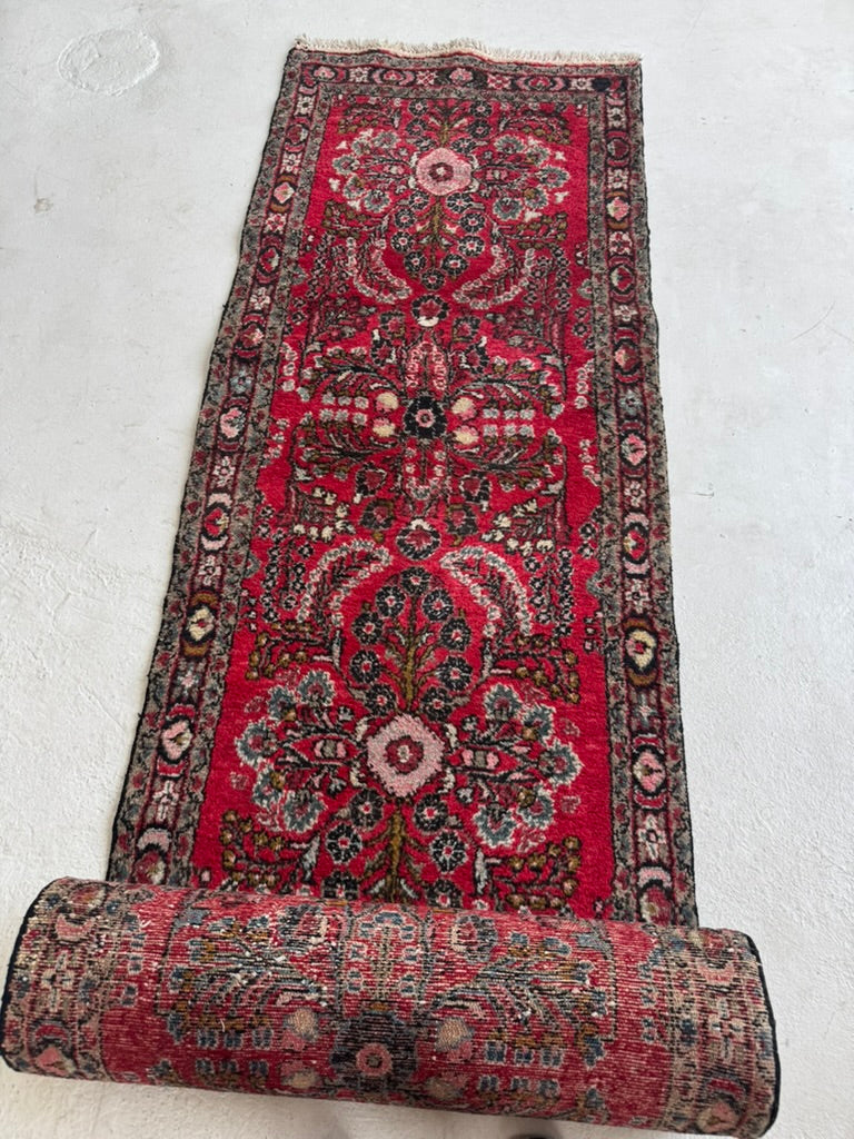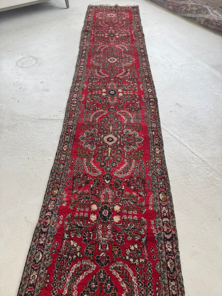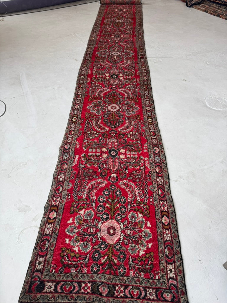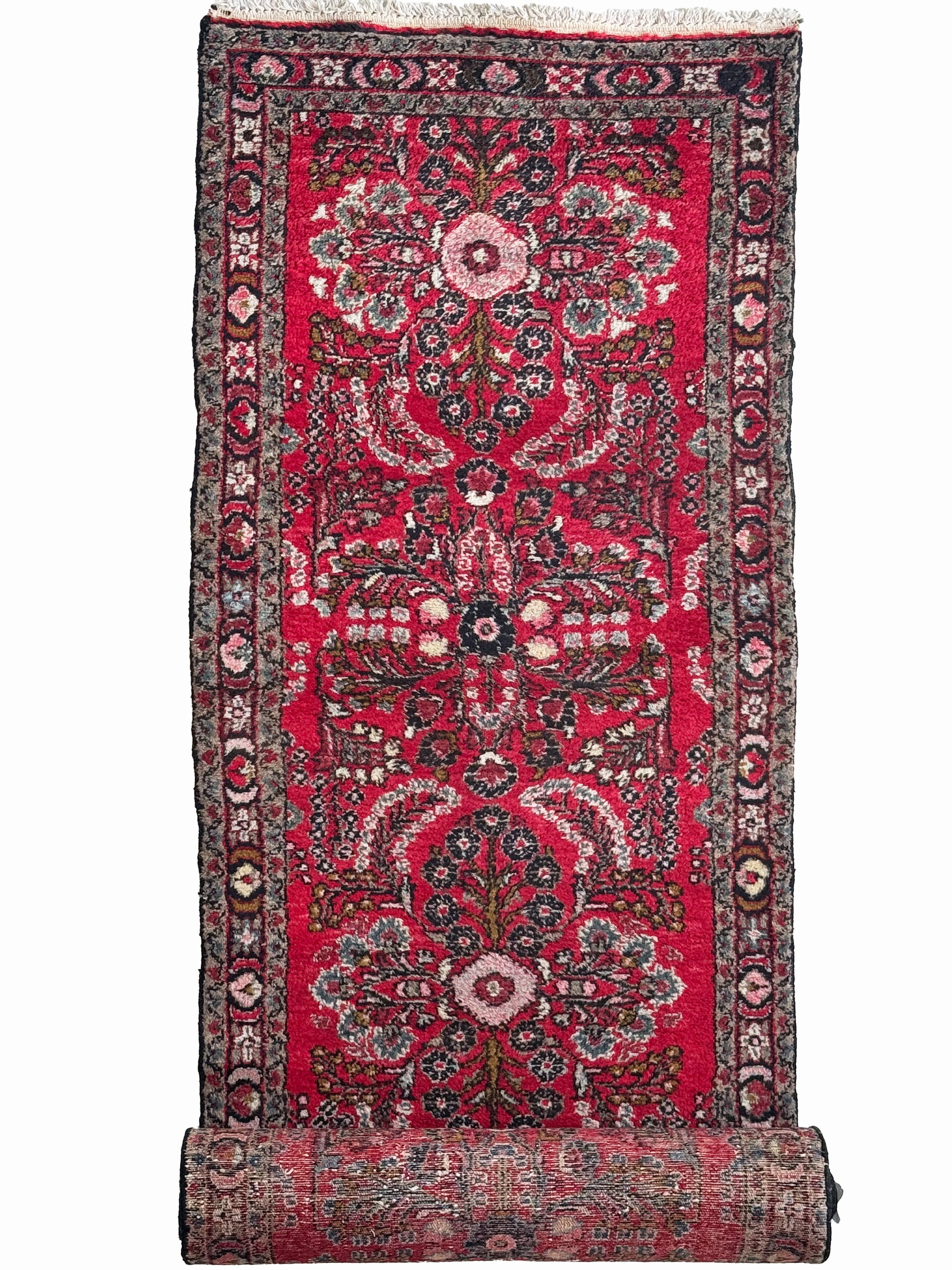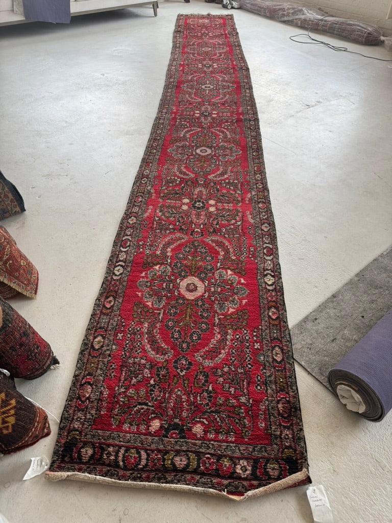Name: Extra Long Vintage Hamadan Sarouk Runner with Rich Strawberry Hues