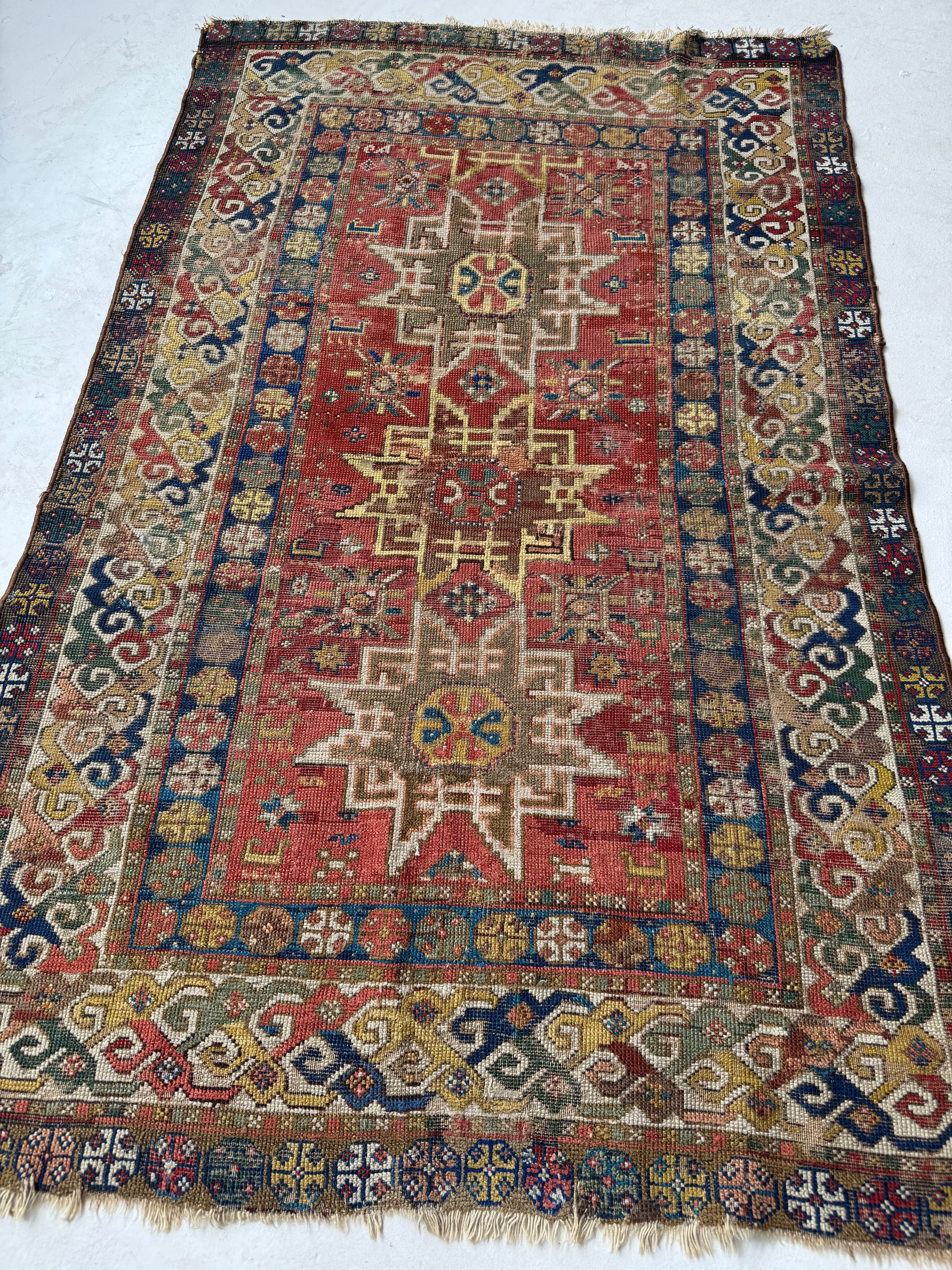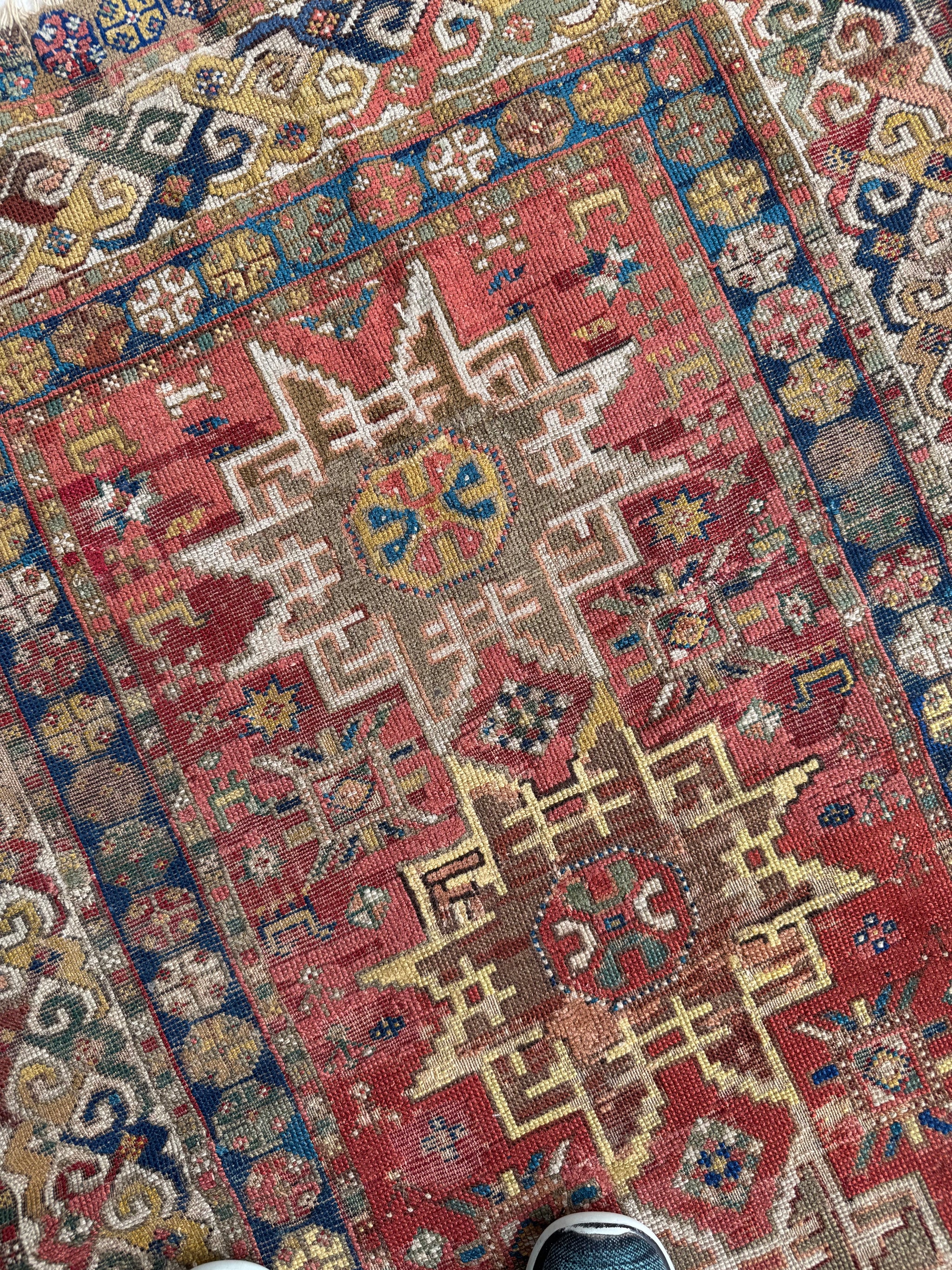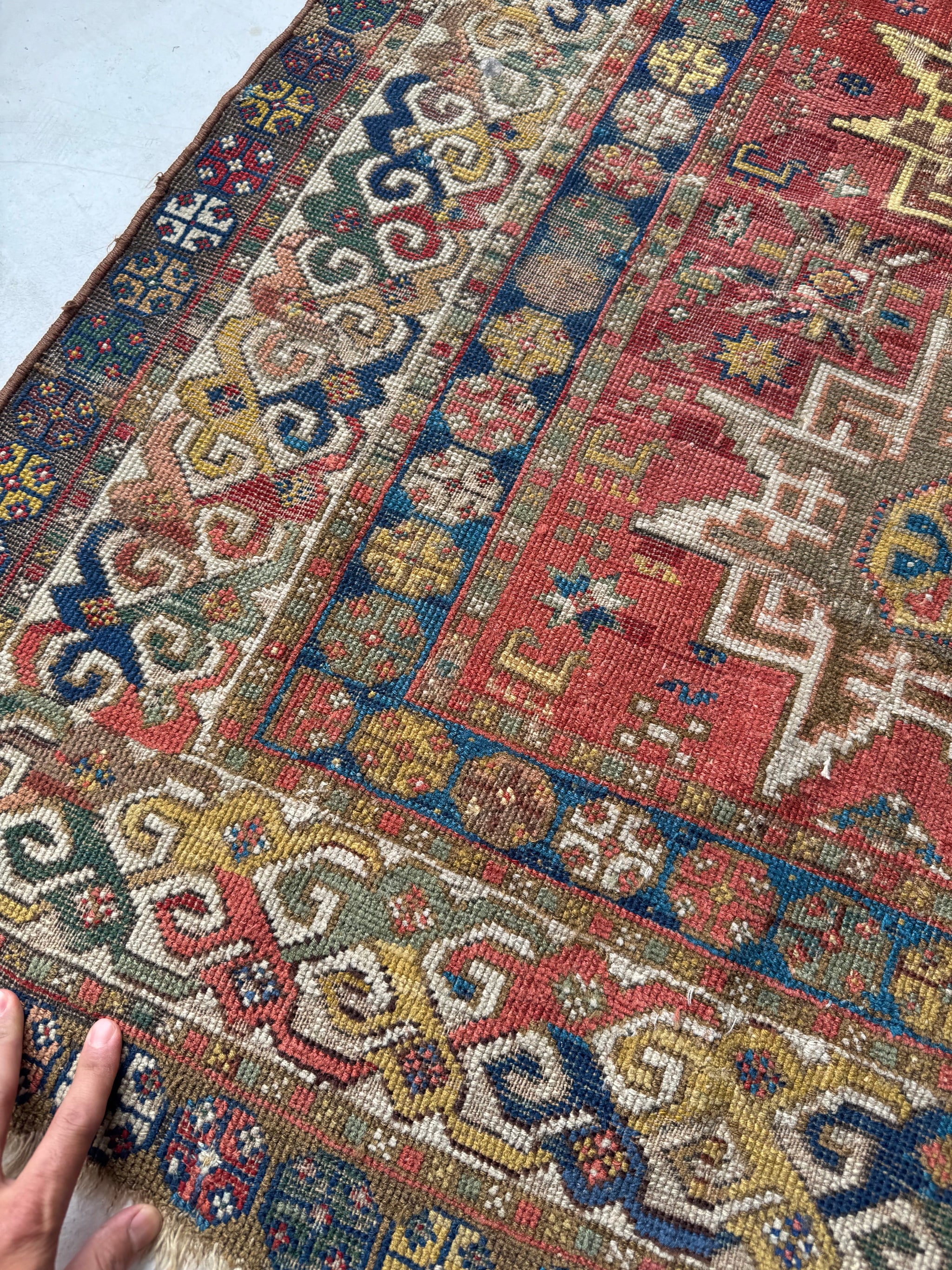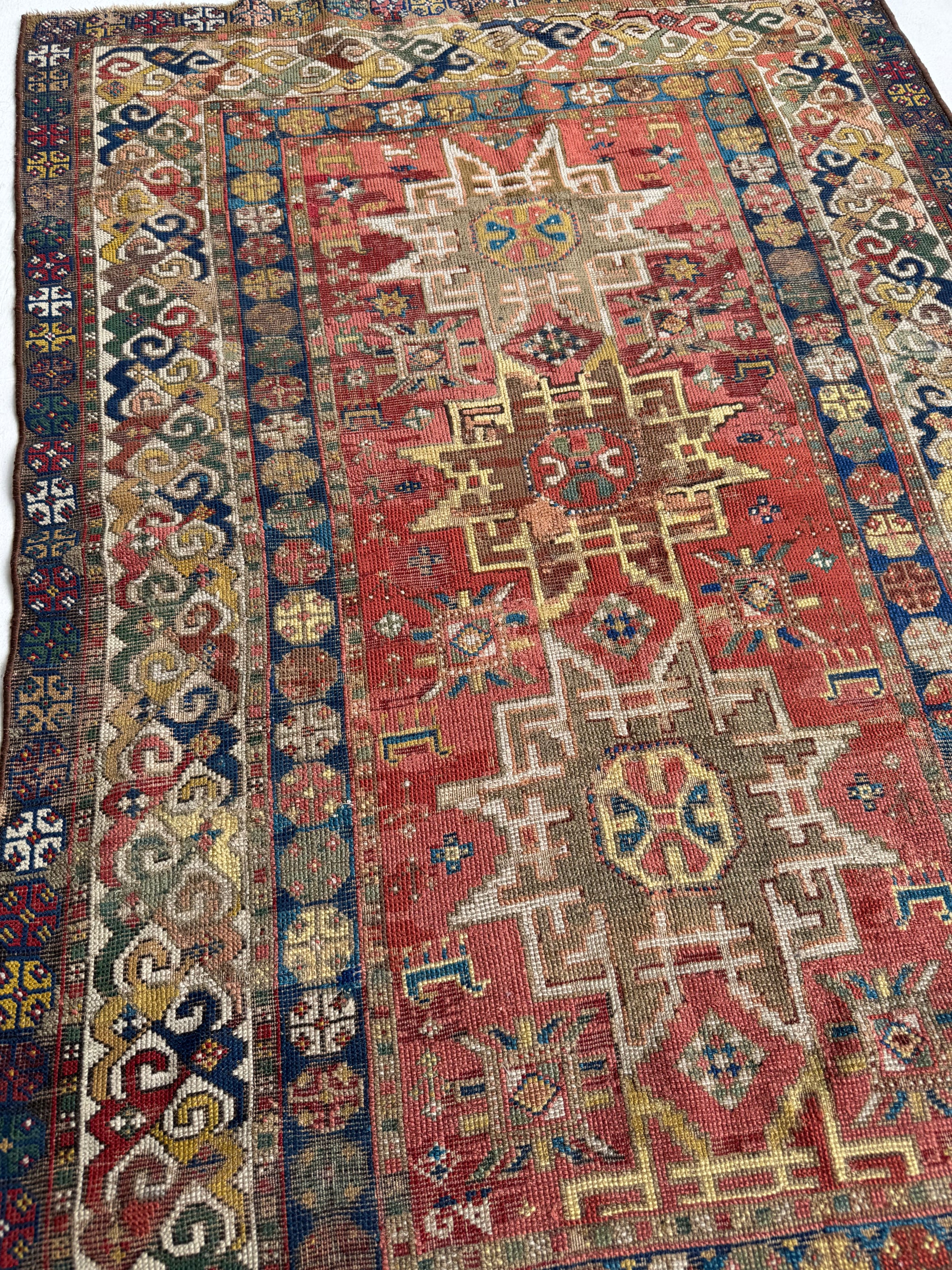 OLLLLD Antique Caucasian Leshgi Star with KINTSUGI Repairs | Lemon, Kiwi, Animals | 3.8 x 5.6