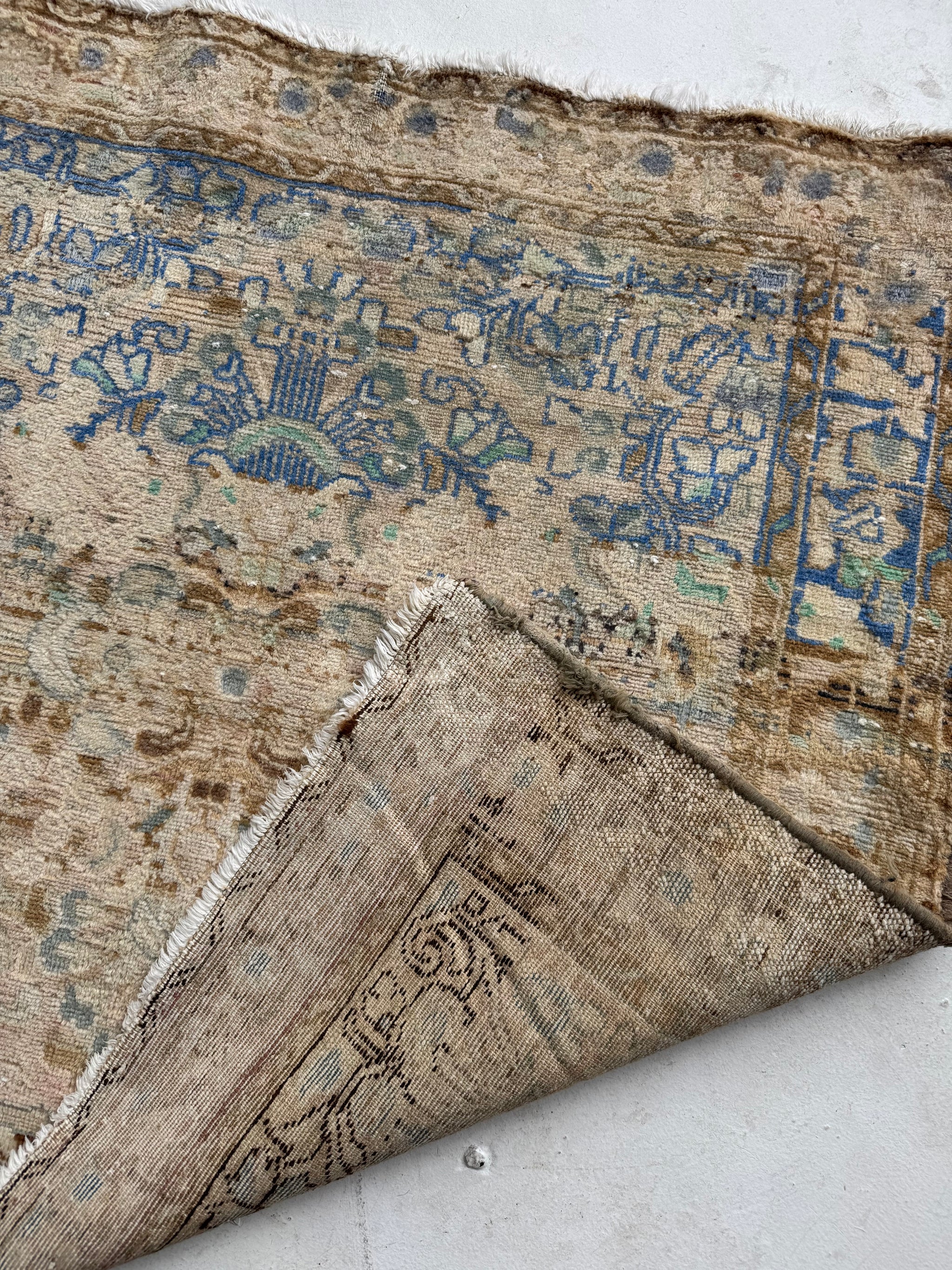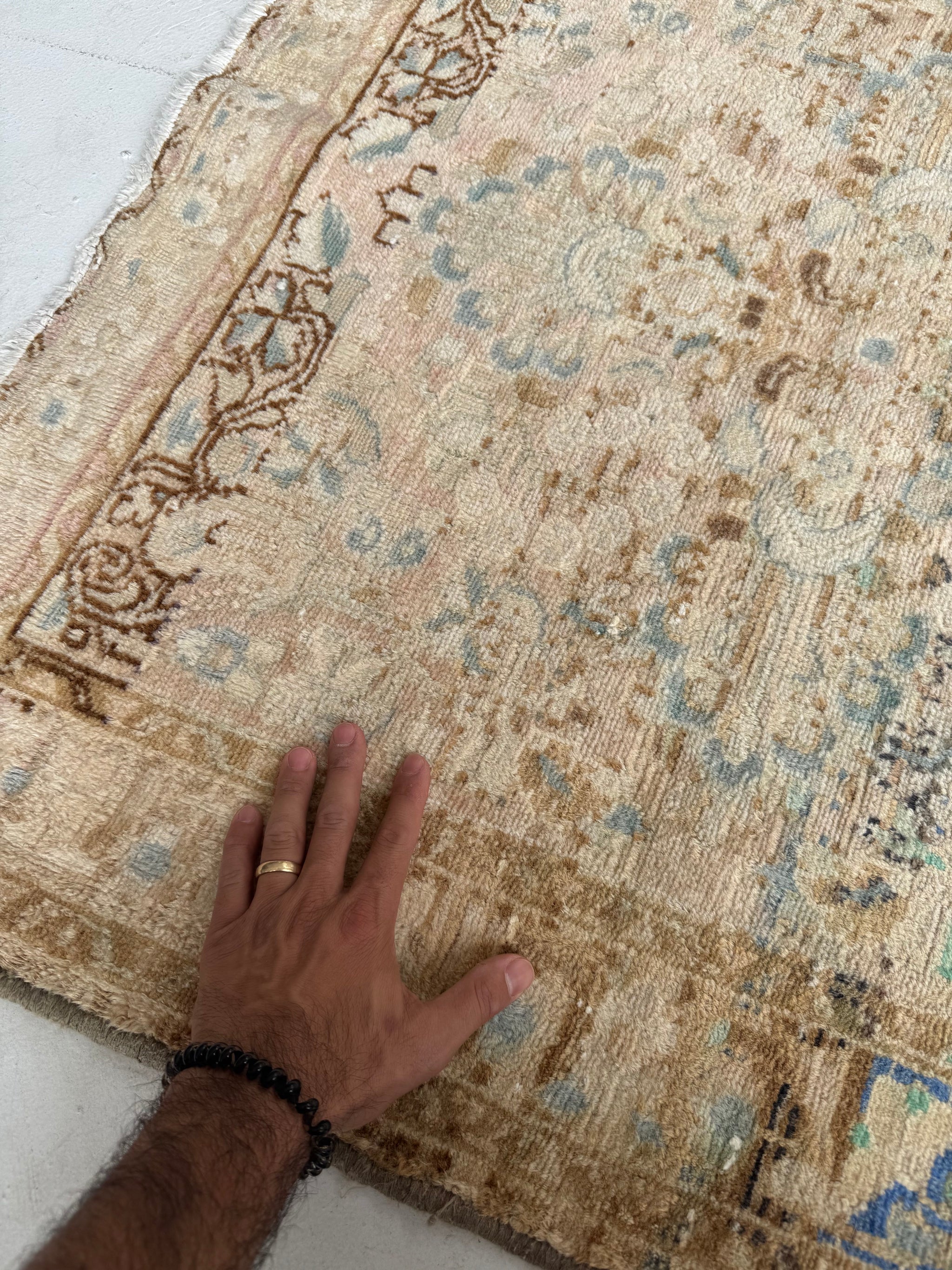 Pile: Low / Medium pile with age-related wear and patina. Super beautiful character-rich piece, lovely piece. This piece has had the colors toned down to offer a more airier and coastal vibe while still staying true to the quality, nature-inspired pattern, and of course it's genuine vintage age.